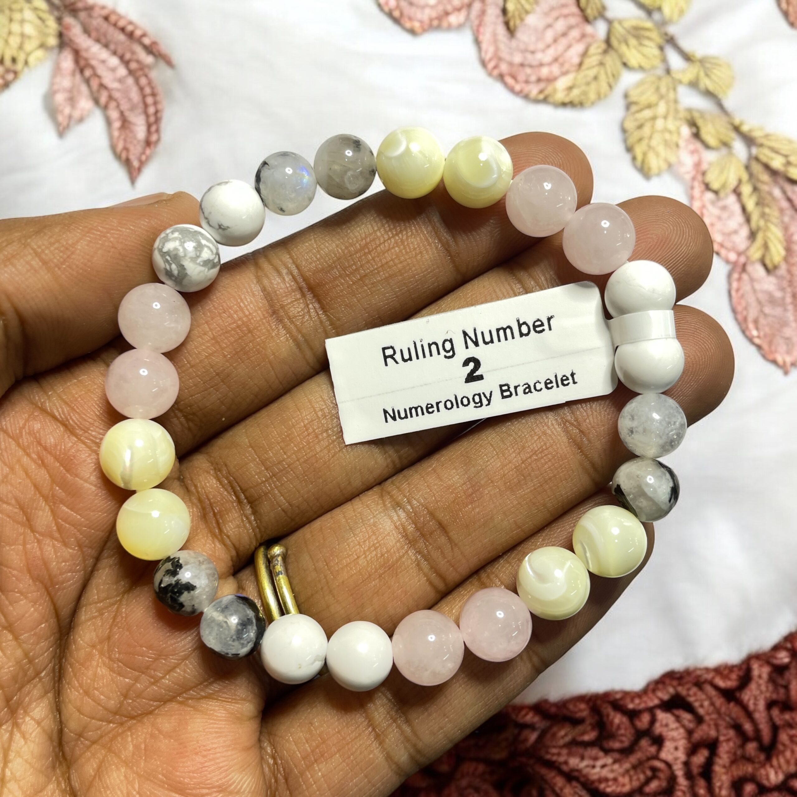 Beautifully crafted with Howlite, Mother of Pearl, Moonstone, and Rose Quartz, the Ruling Number 2 Bracelet is designed to support emotional harmony, intuition, and inner peace—core qualities of those influenced by the number 2 in numerology.