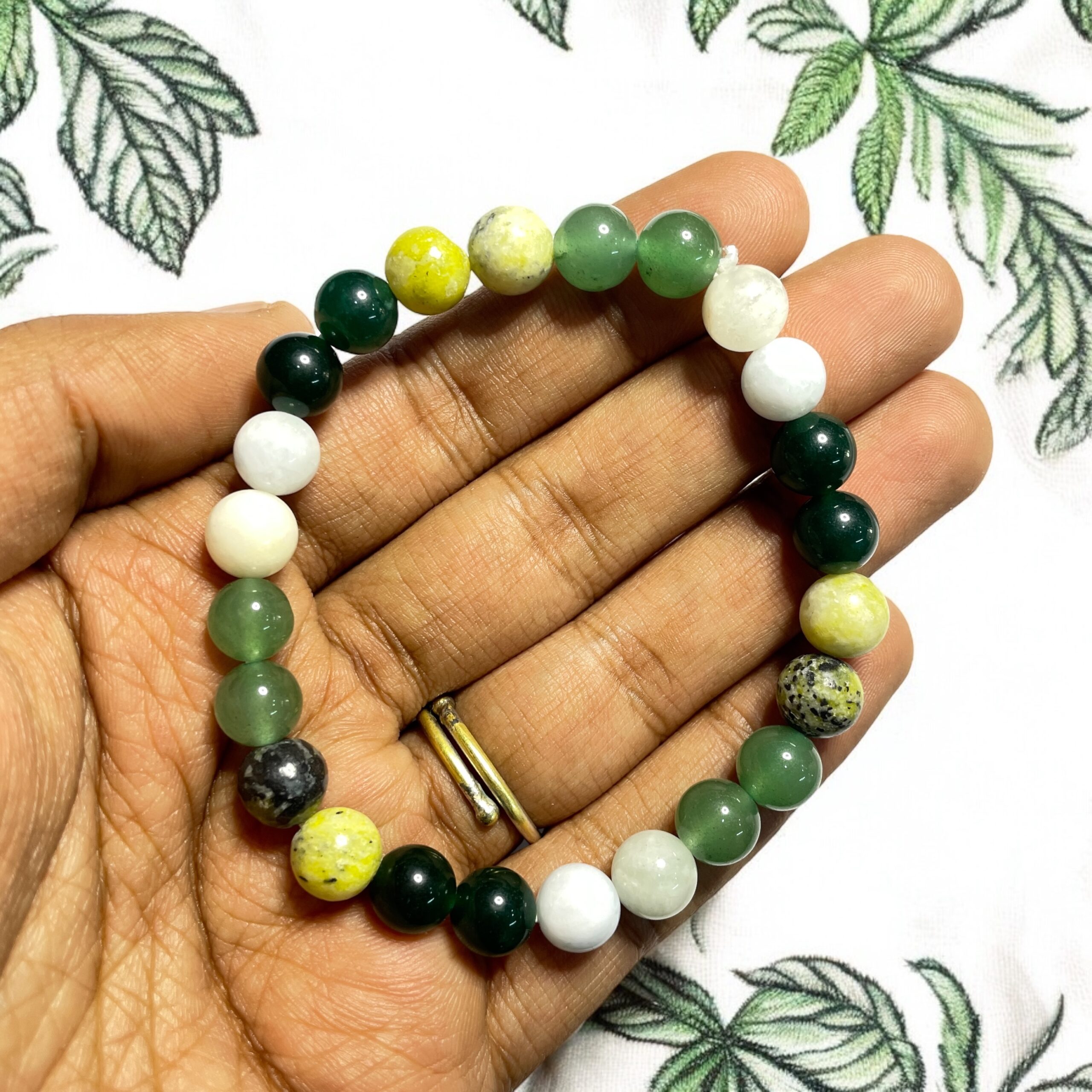Specially crafted for individuals aligned with the vibrant energy of Ruling Number 5, this bracelet blends the dynamic properties of Green Aventurine, Jade Green, Serpentine, and Aquamarine. It supports adaptability, effective communication, and a strong sense of personal freedom—key traits of number 5 in numerology.