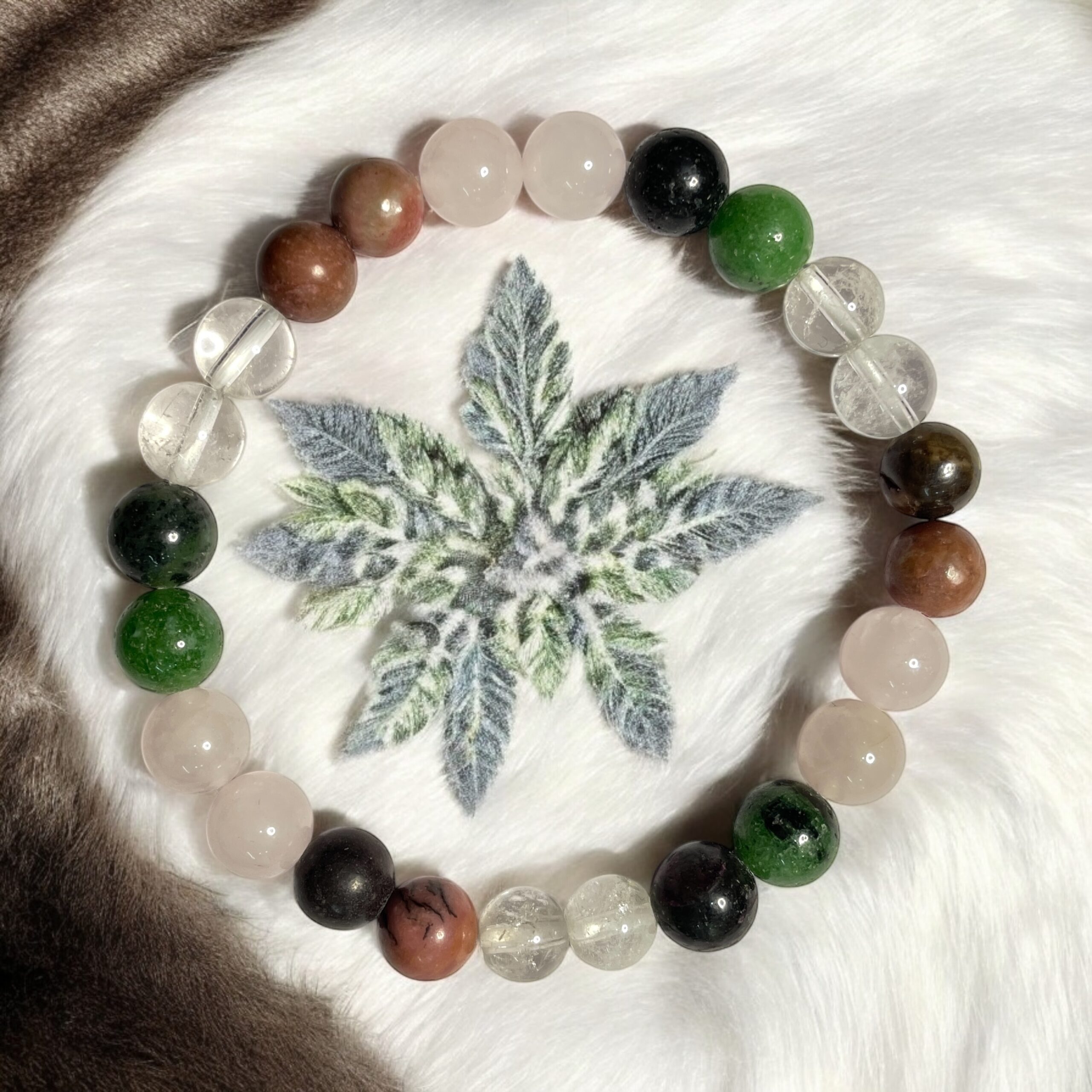 Created to support those influenced by Ruling Number 6, this bracelet enhances harmony, love, and emotional well-being. Aligned with the nurturing energy of Venus, the ruling planet of number 6 in numerology, it features a synergistic blend of Rhodonite, Ruby Zoisite, Rose Quartz, and Clear Quartz.