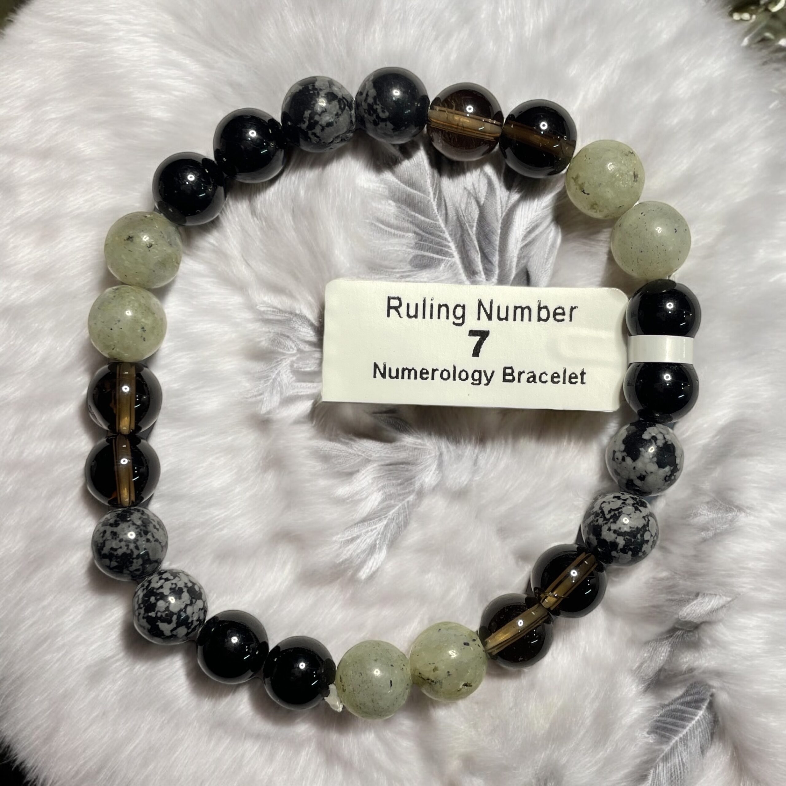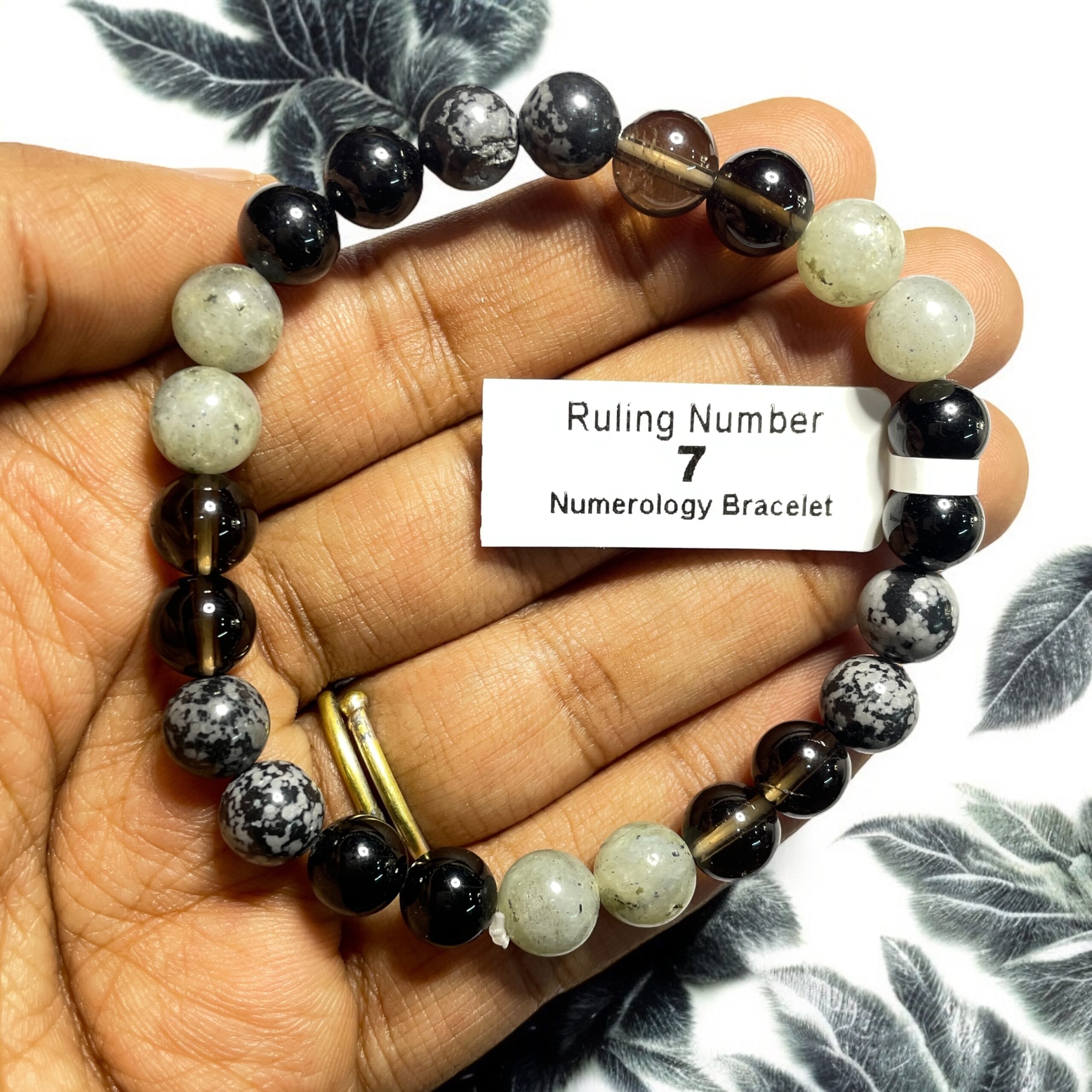 Specifically designed for those with Ruling Number 7, this bracelet is infused with the grounding and intuitive energies of Black Tourmaline, Smoky Quartz, Snowflake Obsidian, and Labradorite.