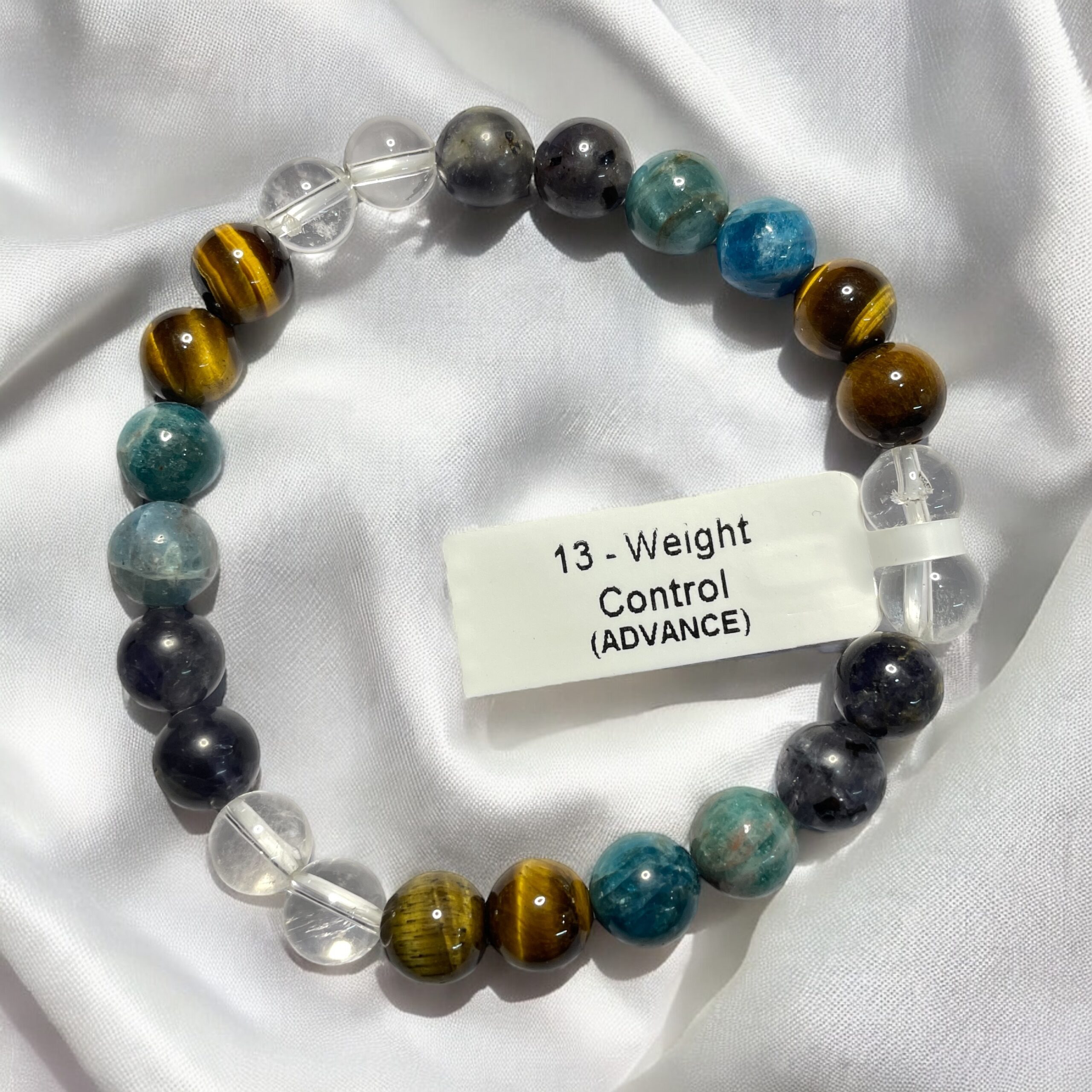 The Weight Control (Advance) Bracelet is intentionally crafted to support your physical and emotional balance during your weight management journey. This powerful bracelet combines Clear Quartz, Iolite, Tiger’s Eye, and Blue Apatite, each chosen for its ability to enhance motivation, control cravings, and foster a focused and positive mindset.